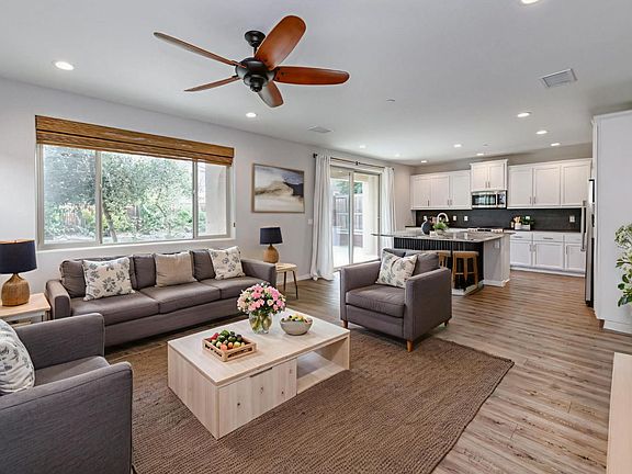 Discover this beautiful 1581 sq ft home with two-bedrooms, two-and-a-half-baths & a versatile office/den, set within the nationally acclaimed master-planned community of Tesoro Viejo in Madera. Framed by the Sierra foothills and near the San Joaquin River, Tesoro Viejo offers a lifestyle like no other with scenic walking trails, neighborhood parks, a resort-style clubhouse, pool, gym, and even a community cafe. This thoughtfully designed home welcomes you with a tile roof and lush professional landscaping, including a large backyard with synthetic lawn and extended patio space perfect for entertaining or relaxing under the stars. Inside, the kitchen is the heart of the home with slab countertops, designer tile backsplash, & GE Caf stainless appliances, all enhanced by abundant natural light. Beautiful wood laminate floors flow throughout the main level, while upstairs features upgraded carpet in the bedrooms. Offering style, comfort, and connection, this home is your chance to experience the best of Tesoro Viejo living. You are going to love where you live!
