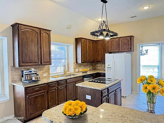 Move-in ready! Beautiful single-story home in prime West Plano with quick access to George Bush Turnpike, Preston Rd, and the Dallas North Tollway. Filled with natural light, this 3-bed, 2-bath offers open-concept living, a designated study, and a split bedroom layout for added privacy. Updates include extensive wood flooring, crown molding, decorative lighting, and a stylish kitchen with stainless steel appliances, granite counters, stone backsplash, and a breakfast bar. The spacious primary suite features a sitting area, granite vanity with dual sinks, travertine-tiled shower with frameless glass, jetted tub, and two walk-in closets. Enjoy outdoor living on the stone patio overlooking a lushly landscaped backyard.