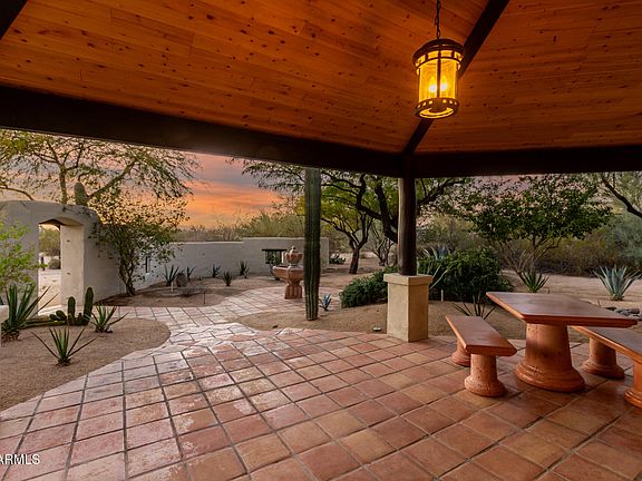 The private courtyard welcomes you with beautiful Saltillo tile, a soothing fountain, and a covered patio, offering a peaceful and inviting entry. Inside, the spacious great room boasts large sliding doors that open to the backyard, allowing for a seamless transition between the indoors and outdoors—ideal for enjoying the serene Cave Creek lifestyle. The gourmet kitchen, designed with both style and function in mind, connects effortlessly to the living area, creating a perfect setting for entertaining or quiet moments by the pool. With the patio just steps away, it's a true indoor-outdoor retreat. Adjacent to the RV garage, you'll discover a versatile bonus room with its own private entrance, offering endless possibilities. Whether you envision it as a quiet office, a cozy casita, or a functional workshop, this space can easily adapt to your needs. The room is further enhanced by a charming covered patio with stylish pavers, adding both convenience and appeal. With its own separate access and outdoor space, it provides the perfect balance of privacy and functionality, making it an ideal extension of the home.
