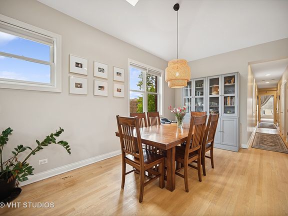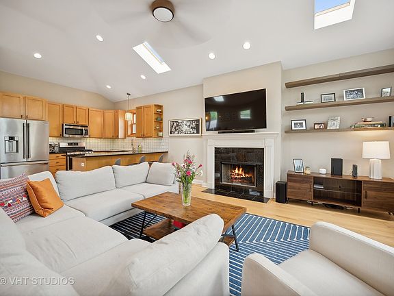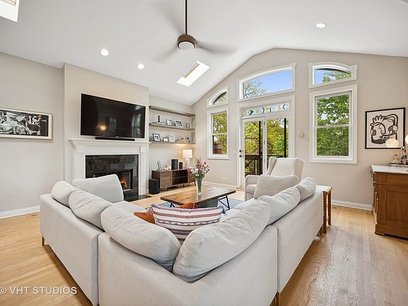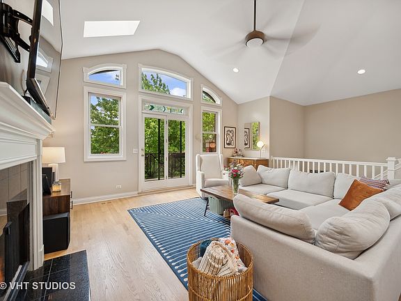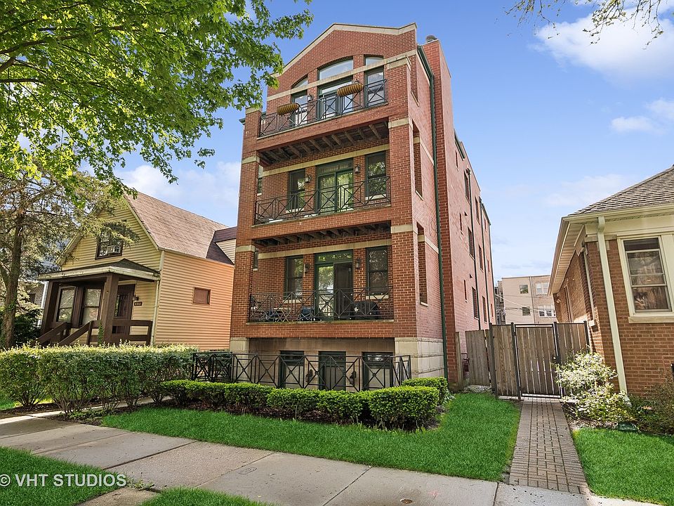Fabulous 3 Bedroom/2 Bath condo on the top floor with lovely views of the tree-lined street. The open floor plan is graced with hardwood floors, wood burning fireplace, vaulted ceilings and three distinct outdoor spaces. The east, south and west exposures provide generous sunlight year round. The kitchen overlooks the living/family room and provides seating for 4 at the breakfast bar. There is an adjoining large eating area that makes this the ideal spot for entertaining or friendly get-togethers. Very large primary bedroom with a walk-in closet and en-suite bath featuring double sinks, separate shower and tub and private outdoor space for morning coffee or a glass of wine while watching the sunset. Two additional bedrooms and a hall bath provide ample space for a growing family or guests from out of town. Did we mention the new Carrier HVAC system, or the outdoor space large enough for outdoor dining, plants and a grill! Plus a one car garage space!! All of this conveniently located on a quiet residential street close to public transportation and Horner Park.