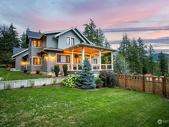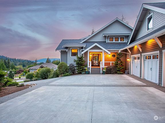 Perched on a hill in the desirable Samish neighborhood, this custom-built home on 2/3 acre overlooks the bay, islands and evergreens. Upon entering, you'll be greeted by a timeless open-concept design with beautiful kitchen and large island, dining, living room and direct access to massive covered deck with steps to fenced backyard. Main floor primary with en suite, built-in desk area and large utility. Upstairs features an open loft, three more bedrooms and full bath. Basement is fully finished with well equipped gym, bedroom, bath, family room could easily be rental income. European multi-tilt windows & doors, 1200+ sf garage w/336 unfinished sf above garage + huge under deck storage, room for a shop. Private yet mins to Lk Padden & town.
