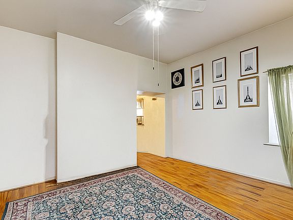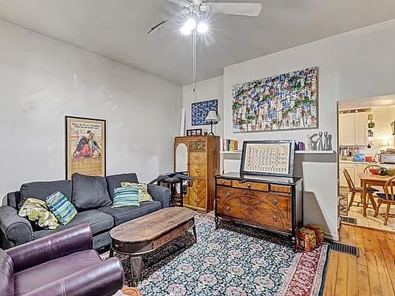 This home has a nice shaded front porch for outdoor living. As you enter in from the front porch it opens into a large space (see pictures, one picture is AI adjusted to remove the furniture so you could see what the room looks like) , that flows thru to the modern kitchen, complete with new gas stove, and huge side-by-side refrigerator.