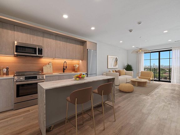 Outdoor fire placeResort-style poolWide-plank flooringPremium bosch appliancesQuartz countertopsOverlooking downtownModern loft living