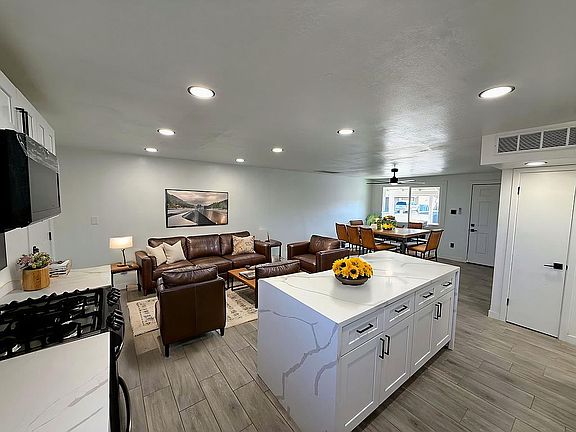Stylish and modern kitchen- featuring all new stainless-steel stove and microwave, large island, modern recessed lighting, sleek tiled backsplash.