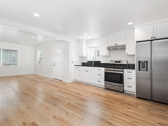 Experience modern living in this beautifully renovated single-family home, thoughtfully updated from the ground up inside and out. This stylish residence features brand-new wood flooring, sleek recessed lighting, and fresh cabinetry throughout. The kitchen comes equipped with brand-new appliances, including an oven range and refrigerator, along with washer and dryer hookups for added convenience.