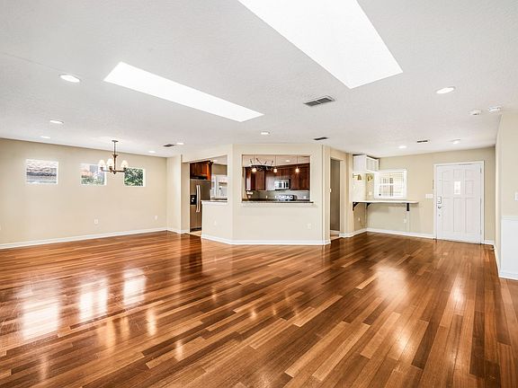 This pristine great room plan is open and airy with like new design features. Enjoy wood flooring in living areas lined with large windows and skylights for ample natural lighting. The kitchen boasts wood cabinetry with molding, granite countertops, Travertine flooring, and also has a breakfast bar opening to the living room and dining area. Stainless steel appliances are a plus and create the gourmet look ready for your personal cuisine. French doors from living room and dining room open to paved rear lanai with a tiki-style outdoor bar. Bathrooms updated with newer mirrors and tumbled marble effects on tub encasement. A spacious primary bedroom with plenty of wall space for your larger furniture pieces. Enjoy lush landscaping and a fenced in yard. You are only minutes from the Orlando International Airport, several major employers, and plenty of downtown activities. Boating in Orlando? This subdivision is one of few with its own private boat ramp to the beautiful and ever popular Conway Chain of Lakes.