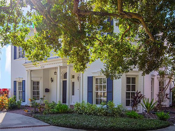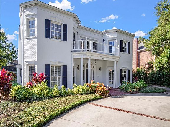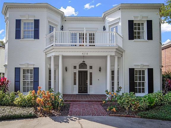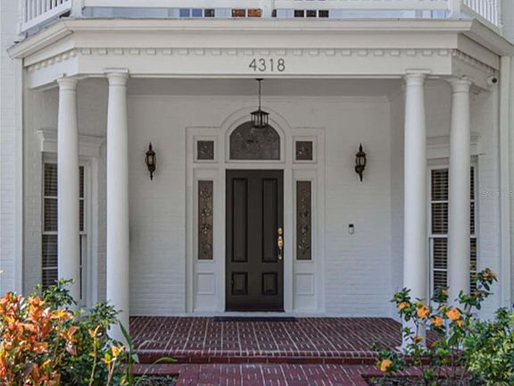 The search for THE statement house stops here. This elegantly handsome Regency mansion is a rare gem crowning Azeele's estate row.  Custom crafted, thoughtfully updated, 4318 hearkens back to a time where stylish lines and elegant proportion turned heads.  The gracious columned portico ushers you into the large entrance hall with its romantic, sweeping staircase; the perfect axis to lead you through the house, as you conjure the possibilities of family living and gracious entertaining.  Living room, custom-fitted library with a hint of a British accent, large family room with fireplace, brightened by walls of French doors, and glowing hardwood floors, all flow easily to one another, and to the large formal dining room, through the butler's pantry to the elegant, sunny kitchen and breakfast room, past the downstairs guest room with its French doors to the pool courtyard, out to the bright, elegant pool surrounded by intimate gardens, pool storage and oversized garage.  Upstairs the Master takes over one wing with its large bedroom, dressing room and bath, inviting fireside seating, and French doors to the poolside balcony.   There's a kid's-dream fitted bedroom/playroom and then two more bedrooms and baths up here, with balconies peeking through the oaks, overlooking the front yard and pool in the back. Cannot be duplicated at this price.  In the coveted cradle of South Tampa; so ez to the airport and interstate.  NO FLOOD DAMAGE
