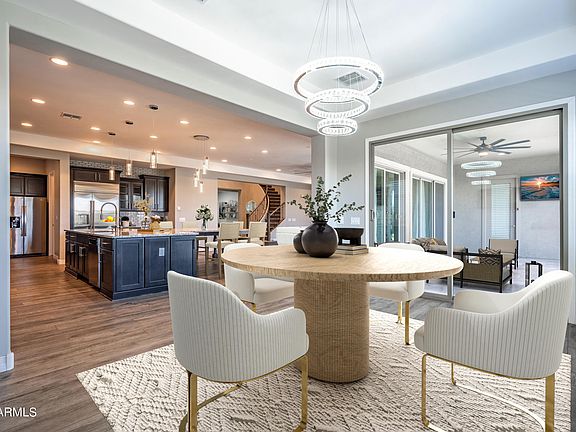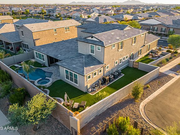 Simply Gorgeous Luxury Home offering true mountain views, plenty of room for your toys in the 5 CAR GARAGE and nearly 5,000 sqft of living space with a multitude of upgrades. Located in Eastmark, one of the most sought-after communities in the East Valley, you'll surely be proud to call this home. WOW....6 Bedrooms, 4.5 Bathrooms, an Office and huge Loft with tv projector and plumbed for a future kitchenette. One bedroom downstairs has it's own private bathroom making it great for a guest or in-law suite. Beautiful modern light fixtures, a chandelier in the large foyer with curved staircase, 3 fireplaces, iron double door entry, ceiling fans, large great room with multi-sliding patio doors and new carpeting throughout makes this home move-in ready. A super shower, soaking tub w/tv and double-sided fireplace, custom closet connected to the oversized laundry room makes this a dream primary suite. The gourmet Kitchen offers a gas cooktop w/vent hood, Butler's pantry, 2 refrigerators, tons of cabinet space and a grand island with seating for at least 6! Outdoors, enjoy the heated pool and spa, additional courtyard space, large covered patio with tv all surrounded by lush green low maintenance turf. Prime corner lot with only one neighbor and just a short walk to the nearest park, hard to find 5 CAR GARAGE with epoxy flooring and storage shelves, security cameras, water softener and RO systems, mud room and extra storage under the staircase.