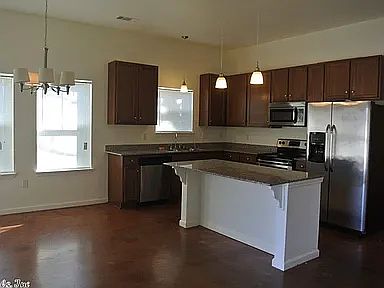 Stained cement floorsCentral heat and airOpen floor planStainless steel appliances