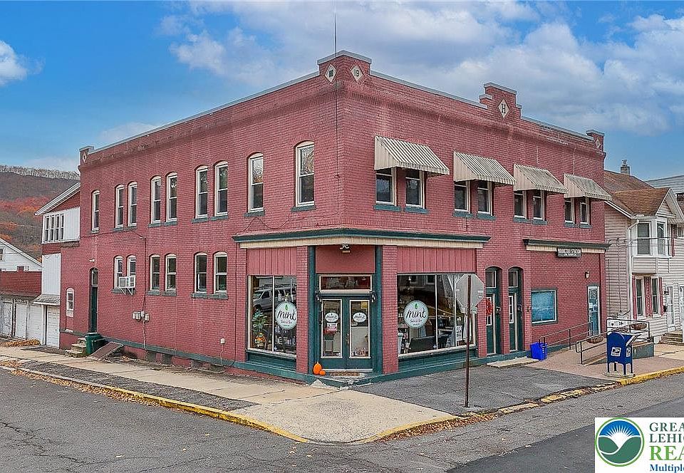 Exciting and rare opportunity to acquire a beautifully maintained investment property in Jim Thorpe! Currently offering four units, two commercial and two residential, the building is at present fully occupied. The main level begins with a large commercial space, currently a salon, with lovely large windows combining with 12’ ceilings to offer a tremendous feeling of openness to the 1100+sf main room. A half bath, treatment room, side entry foyer, and office complete this unit. A second commercial space currently serves as a Post Office at over 1000sf, currently divided into a public commerce area and expansive private rear work room. Upstairs, two spacious apartments both have private front and rear entrances, covered porches to the rear offer outdoor living space with lovely views. Each residential unit offers attractive kitchens, a full bathroom, two beds, ample space for living, dining, and even to work from home and offer attractive original detail in wooden doors and moldings. The building offers a 2400+sf basement with multiple rooms offering a home to utilities as well as ample space for storage. Potential added income comes in the form of a 200sf one-car attached garage and detached 600sf three car garage on the property. A lovely, flat space of lawn is a wonderful shared green space! Jim Thorpe bursts with historic charm, hosts multiple festivals every year and has excellent proximity to outdoor adventures, artistic destinations and easy access to the PA Turnpike!