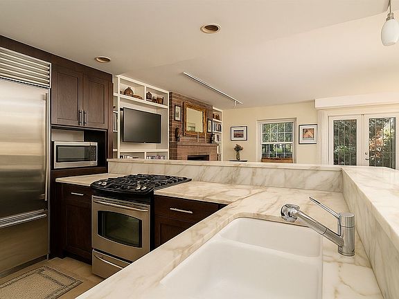 Downstairs, the living/dining area is anchored by a classic brick fireplace and custom shelving. The open marble kitchen features stainless-steel appliances including a gas range, dishwasher, and sink disposal. A second full bath offers a rainfall shower and sleek, modern fixtures. Additional conveniences include a welcoming foyer and a storage room at the lower entry.