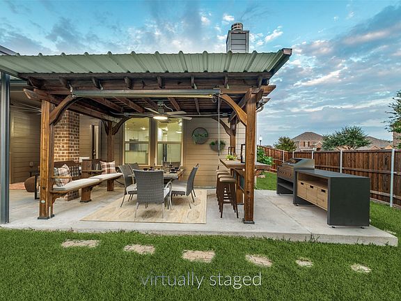 You could be relaxing on this amazing back patio just a few short weeks from now. Beautiful, very clean and well kept, turn-key home with 4 bedrooms, a designated office, and 3 full bathrooms. 3 bedrooms, two bathrooms, plus the office are downstairs. Upstairs is the game room, a full bathroom, and a huge bedroom with a spacious walk-in closet. The master retreat is downstairs. The 2 car garage is 23 feet deep on the right side for an extra long vehicle or extra storage space. The kitchen has granite countertops, gas cooktop, large pantry, and tons of storage. The laundry room has it's own space, so you don't have to walk through it every time you go to the garage. The master retreat has granite countertops, separate shower and soaking tub, and a big walk-in closet. Enjoy the peach and nectarine trees in the back yard as well! The amazing covered back patio even has gas hookup, 3 fans with lights, solar roll-shades that cover the length of the entire patio, and a very nice shed. Other features and upgrades include a security system, wrought iron stair spindles, ceiling fans in all bedrooms and other rooms, and high ceilings. The cast stone, wood burning fireplace has a gas starter. This home is in Prosper ISD and feeds to highly ranked schools. Also enjoy the community pool, pond, water slides, parks, and green spaces. This location is also great because you can do all the things you need without getting on a highway. Come and tour this home today!