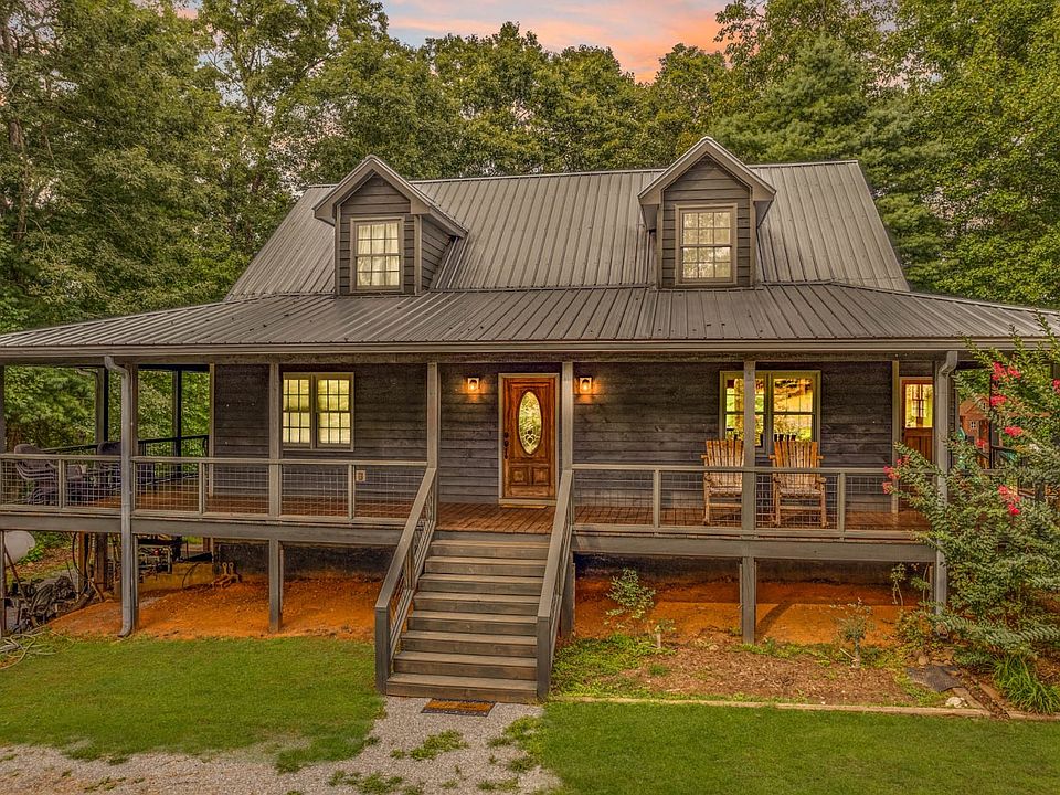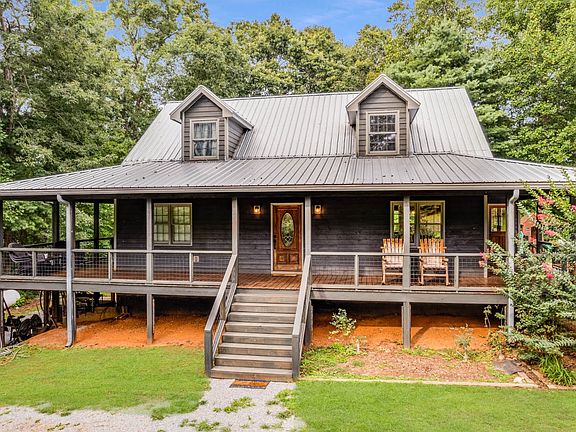 The setting you've been waiting for! This 5 bedroom rustic home features 5 acres with a pasture, gorgeous licklog creek, sounds from the cartecay river, walking trails, fencing, fire pit, playground, substantial deck space, metal roof, foyer, cozy living room with gas stone fireplace, dining area with double doors to porch overlooking creek, spacious kitchen with breakfast bar, granite countertops, wood cabinets, 4 upstairs bedrooms, tons of storage, wood accents, mud room, master on the main, large bathroom with tub and tile shower, walk in closets, full basement with large game/exercise room, additional laundry room, space to add an additional bath, patio for the hottub, and more. This cape cod style cabin is perfect for a family wanting a private escape. New roof and move in ready