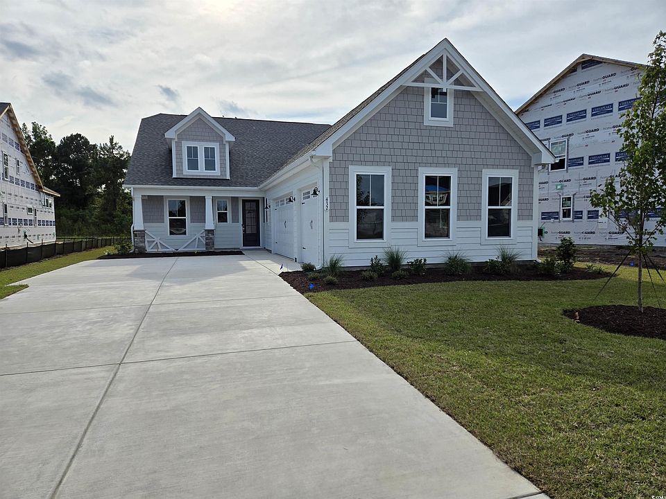 The "Savannah" is a two level with 3385 heated sf, a 3-car garage and the perfect balance between outdoor living space and a coastal-inspired interior, encouraging you to slip off your Flip Flops and relax. This model offers five bedrooms, three full bathrooms, a half bath, and a study. Step in from the Savannah's covered front porch to find an open kitchen, dining, and great room area. Breeze through sliding glass doors onto a 300 square foot covered porch, ideal for warm summer evenings or afternoon get-togethers. You will enjoy the coffered ceiling in the great room, gourmet kitchen with wall oven and chimney hood, luxury vinyl plank flooring in main areas, baths and laundry! The owners bath features a large tiled shower and raised separate vanities with quartz countertops. Whether you’re looking for an abundance of counter space, added seating, or a more intimate gathering area, this model’s options will serve as the solution. Welcome to Waterbridge, an established gated community in the sought-after Carolina Forest area of Myrtle Beach! If you are looking fora stunning location to build anew home that is also rich in amenities for you and your family to enjoy, look no further. Living in Waterbridge means living in a location that brings nature to your doorstep. With treelined and water view homesites, you are bound to find the perfect location to build your dream home. The overall coastal cottage-style homes show curb appeal at every angle and the approximately 120 acres of preserved land and 80 acres of lakes help make this the charming community many have come to love. There is no doubt that the bread and butter of Waterbridge are the award-winning, resort-style amenities featured there. Finding things todo just outside your front door will not be hard here. Grab a friend and go enjoy tennis, pickleball, or basketball. Journey out on Palmetto Lake via a boat launch where you can partake in all of the exciting activities lake life has to offer! Gatherings have never been better than at the beautifully crafted clubhouse with a refreshment center and catering-style kitchen. Break a sweat at the 24-hour fitness center, complete with cardio and weight training options. Waterbridge is also home to the largest residential swimming pool in South Carolina which includes Olympic-size swimming lanes, a landscaped island, jetted spa, and a swim-up refreshment center! Pack a bag because you will want to spend the whole day there! Outside of the community, the Myrtle Beach area has so much to offer! From golf to beautiful sprawling beaches with some delicious restaurants nearby, it will not be hard to find things to keep you busy! Nearby malls and outlets are good for some much-needed retail therapy and there is always a plethora of live entertainment and festivals to bring people together. Highly ranked schools in the Carolina Forest area and the close proximity to medical offices add the perfect touch of convenience. Don't miss the opportunity to call this unique community your home! The photos are taken of another home and not the actual home, please reach out to us for the design selections for this home. Photos are of a similar house.