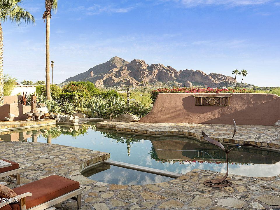 The open floor plan offers spacious living & entertaining areas that flow seamlessly to an expansive stone patio with pool overlooking Camelback.