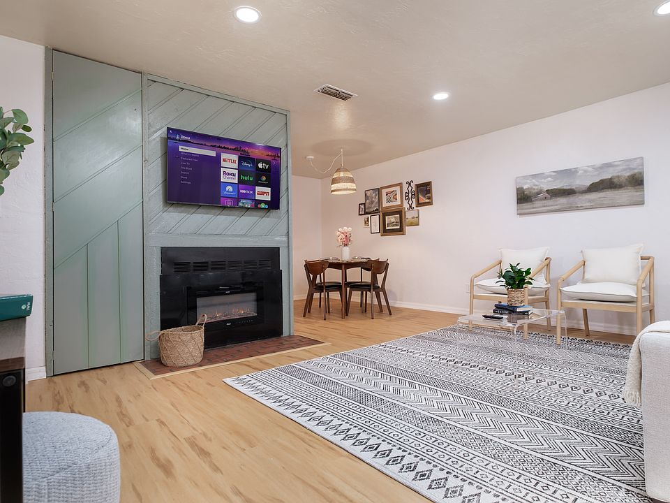 The spacious living room is bright and welcoming, featuring comfortable seating and a flat-screen TV for relaxing evenings at home. The kitchen is fully equipped with stainless steel appliances, countertops, and ample cabinet space for all your cooking needs.