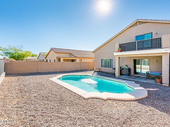 Spacious 3-bed, 3-bath home in Rogers Ranch with a smart split floor plan and a bedroom + bath downstairs. The primary suite features a private balcony, while every bedroom has a bath nearby — ideal for flexible living. Outside, relax by the sparkling play pool with no neighbors behind, just peaceful greenbelt views. Cherry cabinetry adds warmth, and updates like a 2019 HVAC and newer water heater offer worry-free ownership. Conveniently located near the new Loop 202 and expanding shopping/dining, this home is priced to sell—ready to move right in or update with your personal touch.