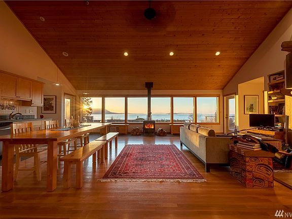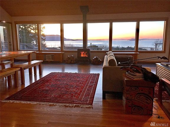A work of art you can live in, with elegant simplicity showcasing stunning west-side views, ever changing sunsets, and an amazing 13' totem pole that tells the story of the San Juan islands. The sunny & inclusive great room is perfect for entertaining, with vaulted ceilings, skylights, wood floors & fireplace. Each bedroom suite features French doors opening to the wraparound deck. Includes beach rights for sun bathing, beach combing and kayaking from the island's most beautiful westside beach.