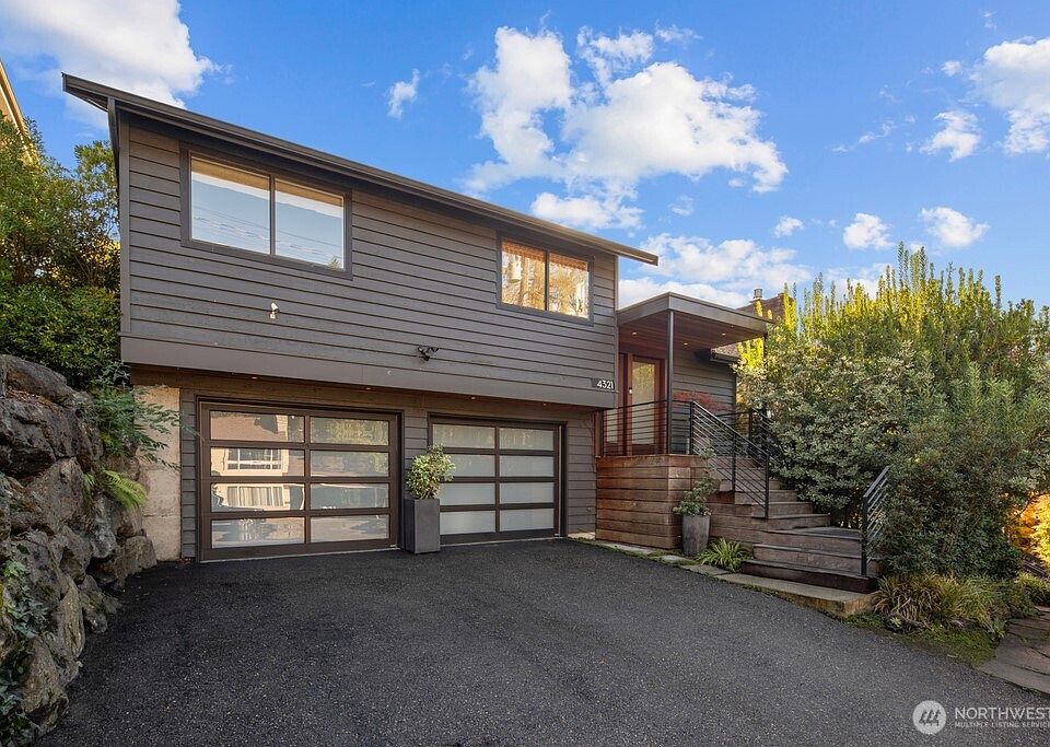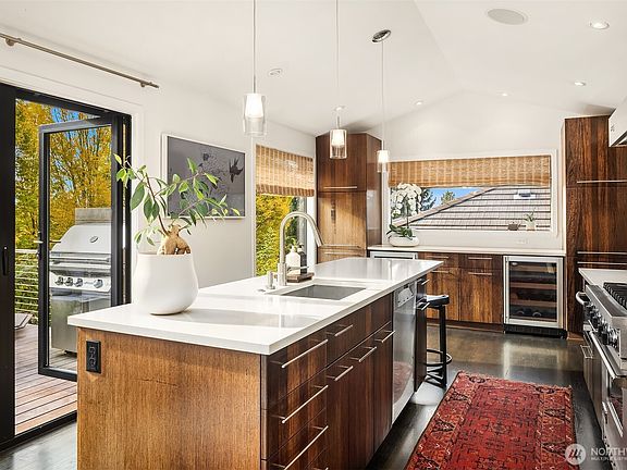 Seamless Indoor/Outdoor Living: Stunning NW Contemporary located above Ferry & Lincoln Park w/beautiful Sound & Mtn views. Light floods open-concept living space w/vaulted ceilings & dark hardwoods. Spacious living rm w/gas frplc flows to Chef's kit w/top-of-the-line appls, beautiful cabs & inviting eating area-perfect for culinary enthusiasts who appreciate views while cooking. Nanawalls lead you to private Ipe deck for alfresco dining & relaxation. Luxurious primary suite w/3/4 bath & 2nd deck w/hot tub-for unwinding. 2 more bdrms & a full bath w/jetted tub. Versatile lower level boasts rec room w/2nd gas frplc, bar area w/wine fridge, addl bath & utility rm. Landscaped yard w/patio & greenhouse. A/C, 2-car gar w/workshop on quiet street