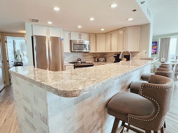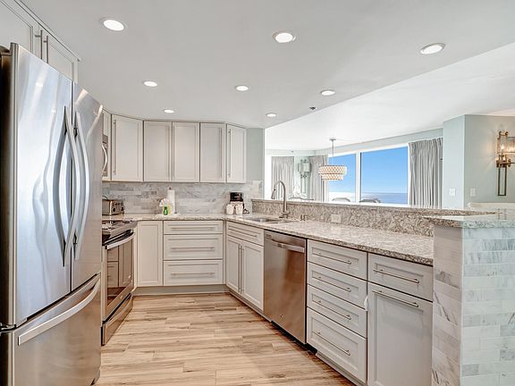 Wrap-around balconyExpansive windowsQuartz vanitiesQuartz countertopsMarble subway tileCustom cabinetryStunning panoramic gulf views