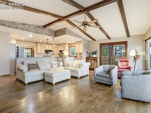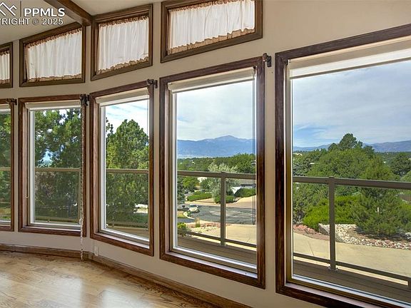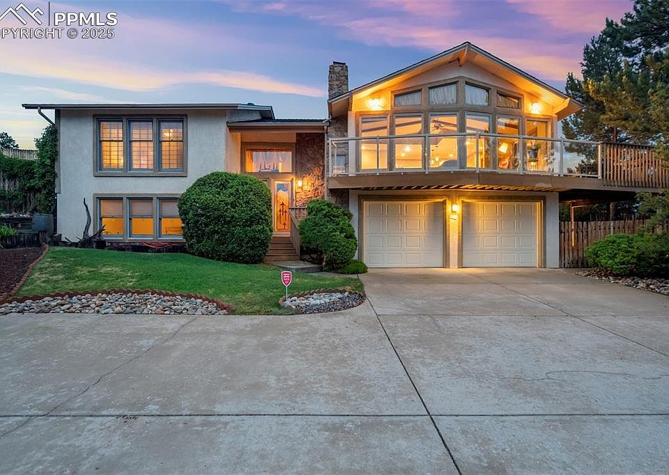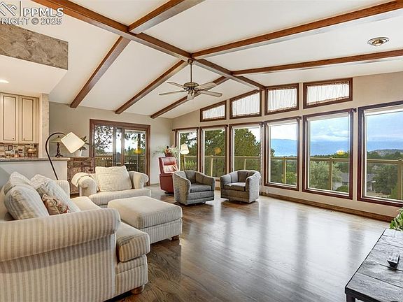 Welcome to this beautifully maintained home, perfectly positioned to showcase panoramic views of the Front Range. As you arrive, you’ll be charmed by the home’s mountain chalet-inspired architecture, featuring a well-kept stucco and stone exterior, an upgraded roof, and an expansive composite deck—ideal for enjoying breathtaking sunsets over the mountains. Inside, a spacious bi-level entry welcomes you in with gorgeous stained glass windows. Upstairs, natural hardwood floors flow throughout the main living spaces. The updated gourmet kitchen is a chef’s dream, complete with custom cabinetry, granite countertops, a large island, gas range, and stainless steel appliances. A separate dining room offers generous space for entertaining and overlooks the tranquil, xeriscaped backyard with its serene water feature and dry riverbed. The great room is a true showstopper—boasting vaulted, beamed ceilings, a floor-to-ceiling stone wood-burning fireplace, and large windows that perfectly frame the mountain views. The primary suite is a peaceful retreat with oversized picture windows capturing Pikes Peak, a 5-piece en-suite bathroom, built-in cherry cabinetry for added storage, and a spacious walk-in closet. A second bedroom and a half bath are conveniently located on the main level. Downstairs, you’ll find two additional generously sized bedrooms—one with stunning views of Pikes Peak—a shared ¾ bathroom, and a large laundry room with built-in cabinetry and folding space. French doors lead from the family room to the private backyard oasis. Outdoor living is just as impressive, with a built-in patio kitchen featuring a gas BBQ—perfect for summer gatherings. Located next door to the Colorado Springs Racquet Club, which offers a pool and recreation center, this home combines comfort, views, and convenience in one extraordinary package.