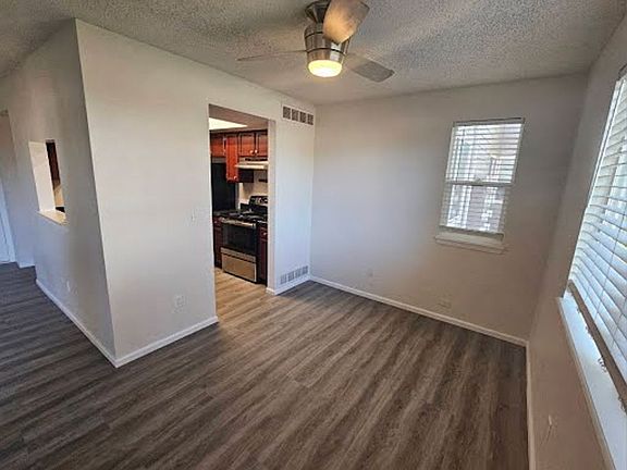 This home includes a large bedroom with an additional sink and vanity, a comfortable living room with a wood-burning fireplace, a separate dining area, and a private patio. Recent updates feature new flooring, modern appliances, an in-unit washer and dryer, and a refreshed bathroom. A reserved parking space is included, along with convenient access to the community pool, tennis courts, and mailboxes.