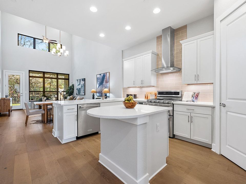 This turn-key two-story condo offers a functional, well-balanced layout with multiple living areas, set against a tranquil backdrop. The main level is arranged for everyday ease, featuring the primary suite, a powder bath, and expansive living and dining spaces highlighted by soaring ceilings, wide-plank wood flooring, and abundant natural light from oversized windows. The kitchen anchors the main living area and includes stainless steel KitchenAid appliances, an island, and a breakfast peninsula with seating—well-suited for both daily living and entertaining. The primary suite is conveniently located on the main level and features a well-appointed bath with a walk-in shower and a spacious walk-in closet. Upstairs, a second living area provides flexibility for a home office or additional gathering space. Two secondary bedrooms share a full bathroom, and a dedicated utility room with cabinetry and a sink adds practical convenience. Outside, a privately fenced yard backs to green space with no rear neighbors, offering a quiet and private outdoor setting. HOA coverage includes insurance, landscaping, trash, recycling, and common area maintenance—supporting an easy, low-maintenance lifestyle in an established Northwest Hills location close to shopping, dining, and everyday essentials, this residence delivers comfort, privacy, and ease without compromise.