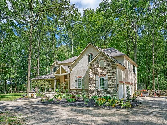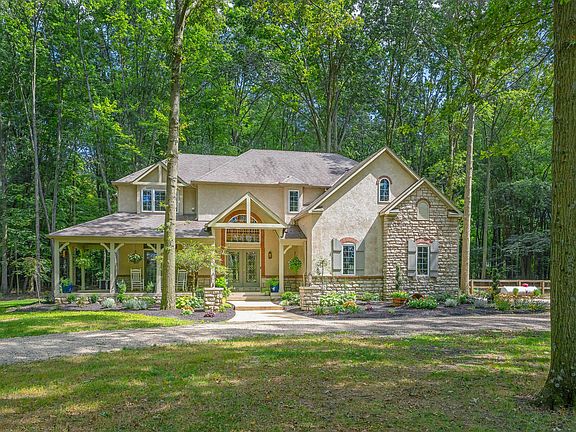 This stunning 4700 sqft home sits on over 6 secluded acres surrounded by trees 1/4 mile back from the road. The large windows in the living room give you a gorgeous picturesque view. The kitchen features an island with a gas range, double ovens, granite counter tops & a walk-in pantry. You can extend your entertainment space outdoors in the screened in porch or on the paver patio. The spacious master suite has separate vanities, duel shower heads, a large whirlpool tub & a massive walk-in closet. The finished basement has endless possibilities with a wet bar, full bath, additional entertainment space & a possible 5th bedroom. A brand-new heated barn outside has 1050sqft providing you with plenty of storage & workspace. UPDATE all beige has been painted agreeable gray, come check it out!