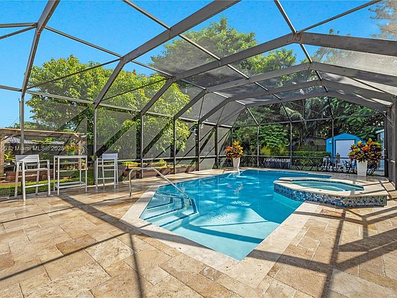 Discover a home designed for those who love the outdoors and living off the land. Set on a generous 14,500 SF lot with 3,202 SF of living space, this updated residence blends comfort with self-sufficiency. Surround yourself with lush greenery, abundant fruit trees—mango, avocado, guava, banana, jaboticaba, sapote—and dedicated flower/vegetable beds. A chicken run with coop provides fresh eggs daily, while multiple sheds offer space for gardening and storage. Outdoors, enjoy a screened pool with travertine deck, outdoor kitchen, pergola, and space for entertaining. Inside, impact windows/doors, roof (2018), updated kitchen, newer A/C, and upgraded closets. This floor plan is flexible layout and could provide space for an efficiency or in-law quarter. Plenty of parking and space for a boat.