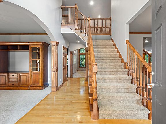 Beautiful 2-Story Estate in Barnard Woods at Thornberry Creek Nestled on a wooded lot, this 6-bedroom, 5-bath masterpiece showcases soaring ceilings, dual staircases with balcony overlooks, and walls of windows surrounding a grand fireplace. Elegant maple cabinetry, flooring, and woodwork pair with Kohler fixtures and detailed ceramics for timeless luxury. The gourmet kitchen, formal dining, office, and guest suite offer versatile living, while the finished lower level includes a 6th bedroom/office and full bath. Brick exterior, zoned heating, and serene wooded views complete this extraordinary home.