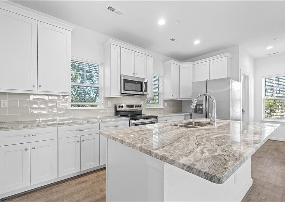 This beautiful end unit garage townhome is ready for you. It is minutes from JEB Little Creek, Naval Base Norfolk restaurants and the Chics Beach. The open layout with amazing natural light is just what you have been looking for. The living space and kitchen, with granite countertops and stainless appliances, are great for family gathering or entertaining. The first floor is a nice suite with a separate back door entrance, full bath and a secondary laundry closet - ideal for extended family living or renting to friends. The third floor features the primary suite, with dual vanity and walk in shower, and two other spacious bedrooms. This unit is next a community gathering area where you can be a part of the community. The garage and driveway make this extra desirable. Generous guest parking and more. See it today!