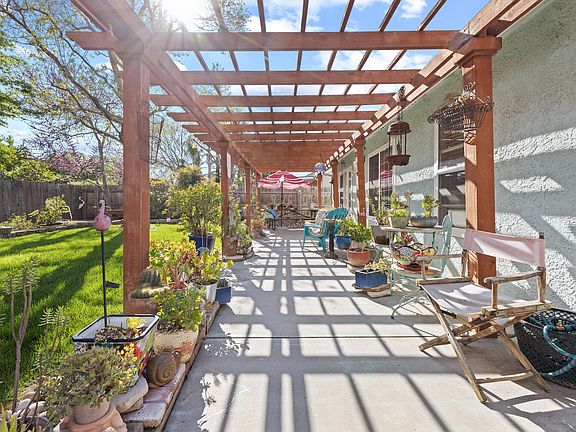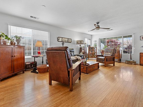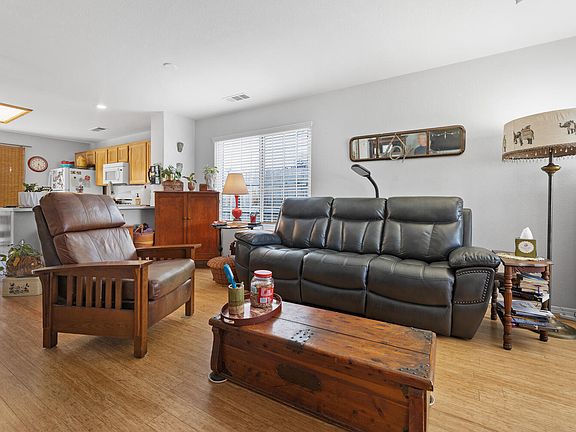 and comfortable it is, with wood floors throughout, and an open concept living space. The spacious kitchen features a functional design and cozy dinning area. The Master suite includes a master bath ensuite with spacious closets. The office/den is a good size and could also be used as a third bedroom. The serene back yard is another wonderful space to relax with a large covered patio and nice landscaping perfect for entertaining or unwinding after the day. There is updated windows and solar. Conveniently located near schools and shopping.