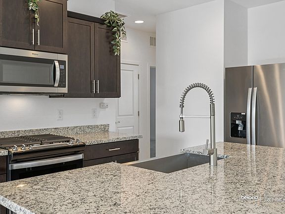 An open layout leads easily into the kitchen, where dark cabinetry contrasts with light stone counters for a sleek look. A large island with seating anchors the space and includes a deep stainless steel sink with a professional-style faucet, perfect for cooking prep or casual meals. Stainless steel appliances and plenty of storage make it a practical hub for both everyday dining and entertaining.