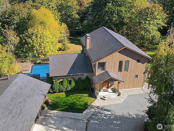 This meticulously cared for custom home was built on 5+ acres of lush landscape, offering privacy & the opportunity to create a dream estate. Natural light spills into the living spaces through large windows along the east side of the home, looking over the seasonally changing trees & valley view. Sliding glass doors lead to a deck just off the dining rm & open concept kitchen w/unique rounded island. Plenty of counter/cabinet space, counter to ceiling windows, large pantry, laundry w/ bthrm on main flr. Upstairs has the spacious primary bdrm w/ a closet, bthrm & deck w/ sunrise views, along w/ a 2nd bdrm & bthrm. 3rd bdrm on lower level. Attached lower garage & detached 2-car garage. Enjoy the pool & pool-deck for those hot summer days!