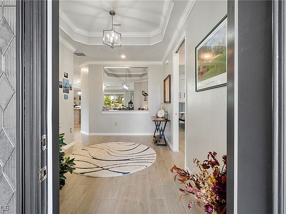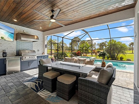 From the moment you step through the custom glass front door, the warmth and thoughtful design of the home unfold before you. The foyer leads directly to a stunning screened-in pool area featuring a tongue-and-groove ceiling, an inviting hot tub, and a full outdoor kitchen equipped with an upgraded grill, hood, TV, refrigerator and gas fireplace. Entertaining here is effortless, enhanced by an electric hurricane storm screen for peaceful enjoyment year-round.