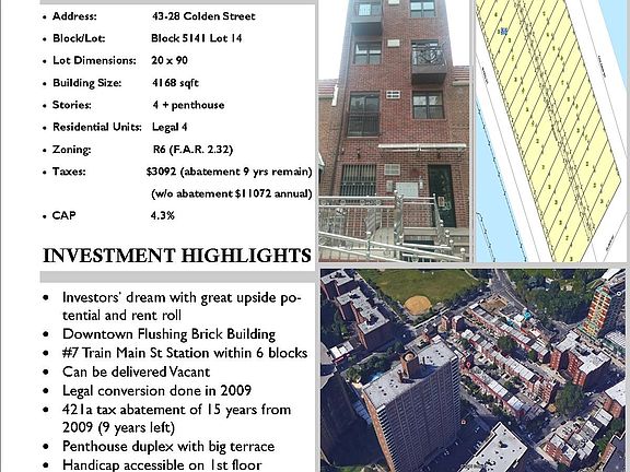 Solid Brick construction. Originally built in 1950, at 2009 Legal conversion and upgrade. 421a abatement has 9 years remaining. Current tax is $3092 annual. 6 Blocks to #7 Train Main Street Station. Can be delivered vacant. Current CAP is 4.3% with great upside potential. Currently is legal 4 family, can be converted to 4 condos. Laundry in basement (shared). 1st, 2nd, 3rd Floor are 2 bedroom units. 4th Floor is duplex penthouse with big terrace. R6 zoning in busy area of Flushing, 1 block walk to Main Street.