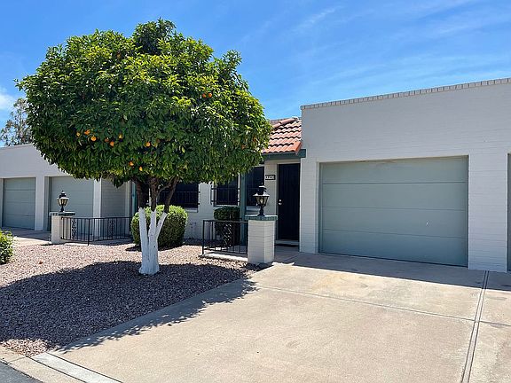 55+ community in Sunland Villas. PERFECT for Snowbirds!! Quick close possible. Ready to move in. Excellent location in Mesa. Quiet area and street. Guest parking in front of unit. 1 bedroom/1 bath 735 sq feet. Eat in kitchen. AZ room is not included in the total square feet. Storage closet in AZ room and patio with grassy area outside back door. 1 car garage with plenty of room for storage. Both entry doors have security screen doors. Community offers Golf/Spa/Pool/Exercise Facilities/Tennis. HOA covers exterior upkeep. Close to dining, shopping and 2 freeways.