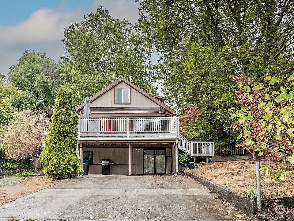 Nicely updated home with partial bay waterfront views from large south facing deck. Main floor has 2 bedroom, large living room and kitchen with eating space. Enjoy a wonderfully private back yard deck adjacent to kitchen. Upper floor is a large open primary suite with walk in closet and en-suite bath. Lower level features a large bonus room, utility room and storage room. Home has been updated to include new flooring and interior paint. Generous parking with 2 covered parking spaces and 3+ additional parking spaces. Corner lot with multiple yard areas. South facing home has great light!