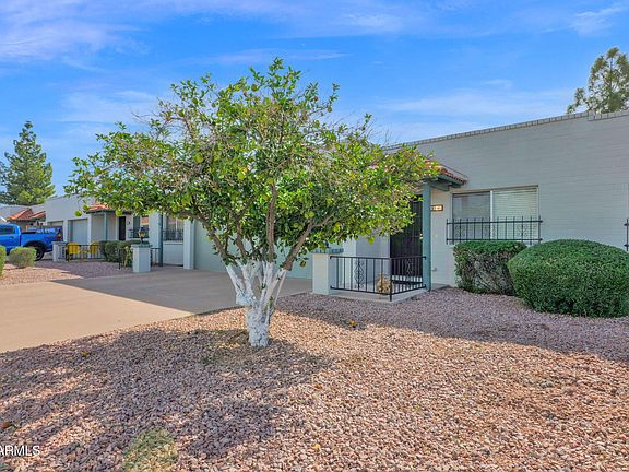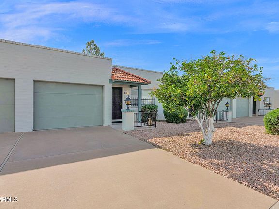SPECIAL FINANCING AVAILABLE. Welcome to your new home in Sunland Village! This cozy 2 bed, 2 bath is perfect for part-time or year round living. This residence offers an attached garage w/ built in storage, and the back patio has additional storage space. Sunland Village is a 55+ community and offers a heated pool and spa, tennis and pickleball courts, a golf course, and even hosts social events! Refrigerator, washer and dryer included.