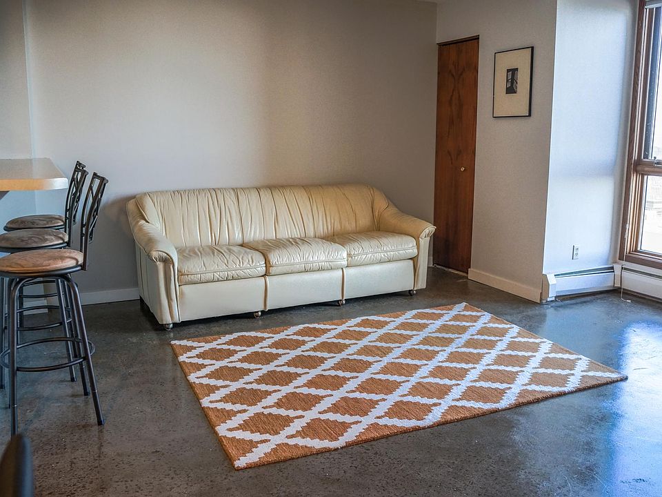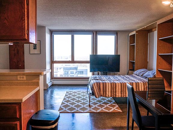 Wear shorts and flip flops year round! Studio apartment directly connected to the Minneapolis skyway. 2 blocks from USBank Stadium with updated polished concrete floors, pool, free laundry, grilling deck, library, and available party room.