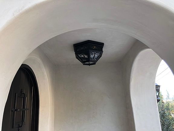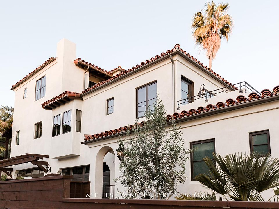 Trellises supporting fragrant jasminePicture windowsQuiet streetTerra-cotta tile roofCustom iron workVolume ceilings