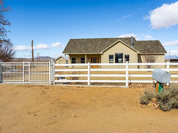 Fabulous Ranch Style Home located on one of the best lots in the subdivision. Finally - open the door to a place you and your family will love to call home. #newhome #homesforsale. Zoned equestrian, backs to BLM land/open space and amazing views of the expansive Sierra Nevada Range as well as the White Mountains. "What we love about this home: Move in ready! Perfect size.... Built in 2013 with 'today's' modern code standards 3 bedroom/2 bath, Great room (living, dining and kitchen), laundry room and a 4 car garage*** Garage Mahal** Light and bright! The Spacious Main bedroom with en-suite bath features a Separate shower and soaking tub, a large walk-in closet, views and access to the covered deck in the private back yard. The additional 2 bedrooms are on the opposite side of the home with the 2nd bath which features a large walkin shower. Beautiful Quartz Counter Tops throughout. Hardwood floors, no steps inside house. True single story. 25 solar panels with a 'new' SolarTesla Battery .... no worries about power outages here. EV plug in garage. Passive solar as well. Located on .8 acres fully fenced with a gate to access BLM land for all your recreational activities. Hardy board siding = no upkeep, which include porches as well. Pie shape lot, so lots of room in back. Think pickle ball court? or horses(pipe corral included). 9 ft plateline (ceiling height) and 4 ft foundation All windows are Double pane, coated, gas filled. All the walls, floor, roof have High R value insulation Vermont soap stone woodstove is absolutely the best heat retainer Fescue grass all with full automatic sprinkler system Code compliant interior ceiling sprinklers Water storage tank. 10x12 pump house with more storage 220 plug in garage for charging EV Remote gate for entry Well is 460' deep Engineered septic What is not to love!!!! This newer home is ready for a new owner. Call your local agent today to view this fabulous property!