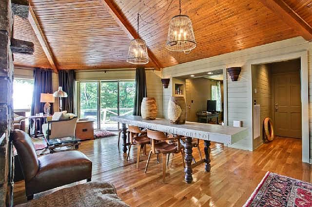 Stunning bluff property with western sunset view. Renovated, 2011! Open floor plan with central stone fireplace. Panaramic views/floor to ceiling glass opening to deck bunk room. Sleeps 20!