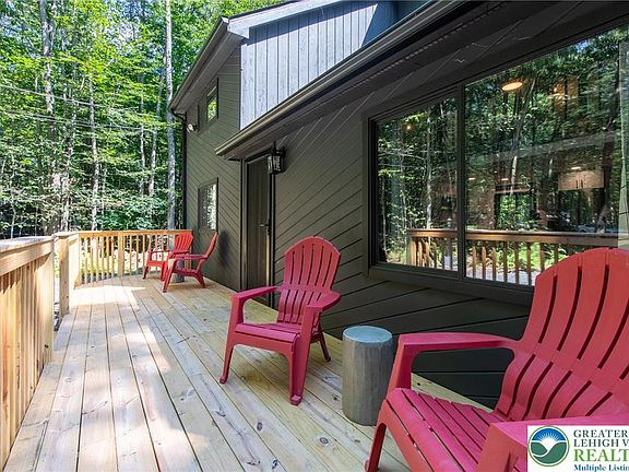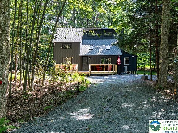 FULLY RENOVATED & FURNISHED, TURNKEY STR OR VACATION HOME! Modern updates meet cozy cabin located in amenity filled Locust Lake Village! This 3 Bed, 2 bath home has a lovely large front deck and on a large, private lot. Enter the home into a gorgeous 2 story living room with brick propane, thermostat controlled fireplace! SS superior appliances and granite countertops make the kitchen a dream! Large dining room with coffee bar is perfect for hosting your family and friends! Luxury vinyl plank flooring, tile floors within the bathrooms, stunning fixtures and high end finishes throughout! Gaming loft with carpet, makes for the perfect hangout space and additional sleeping capacity! Lots of natural light throughout and 2 mini-splits for great comfort and efficiency through all 4 seasons! Outdoor living space is perfect for entertaining. Nice sized covered deck with built in counter and flatscreen TV, gravel covered grilling and fire pit area, two oversized sheds for all your needs, custom built overhang and custom built bear box. Home is walking distance to one of the swimming lakes (0.7 miles). Community is golf cart and ATV friendly in addition to having 2 additional lakes for swimming, kayaking, catch & release fishing, basketball, tennis and volleyball courts, community chalet with events, private ski hill and sledding hill, security and more! This home has everything you can imagine to make your Pocono dreams a reality! Strong rental history available at request.
