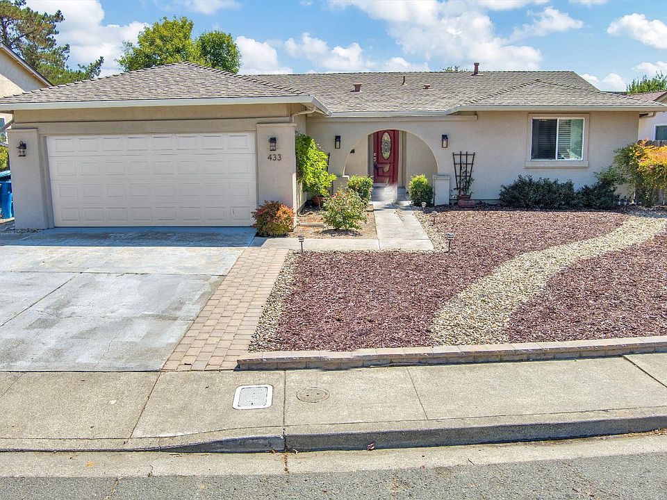 Welcome to 433 Brunswick Drive in Vallejo. This is a beautifully maintained, move in ready home that blends comfort, function, and style. Step inside to an inviting open concept layout bathed in natural light, featuring updated window coverings, a wood burning fireplace, recessed lighting and durable luxury vinyl plank flooring throughout the main living areas. At the heart of the home, the spacious kitchen shines with granite countertops, stainless steel appliances, and ample cabinet and pantry storage, a dream for home chefs and anyone who loves to entertain. Outside you will enjoy your own private retreat. The backyard is a standout feature, with no rear neighbors and offers the new buyer a clean slate to create a space to garden or host outdoor gatherings. The opportunities are endless. The low maintenance landscaping in both the front and back yards means more time relaxing and less time working on the weekends. You'll also appreciate the OWNED solar system, offering energy efficiency and a greener way of living and smart home features such as NEST thermostat and SPAN electrical panel. Tucked away in an established, quiet neighborhood, this home is conveniently located near parks, schools, shopping, dining, and easy freeway access. Virtual staging was used.
