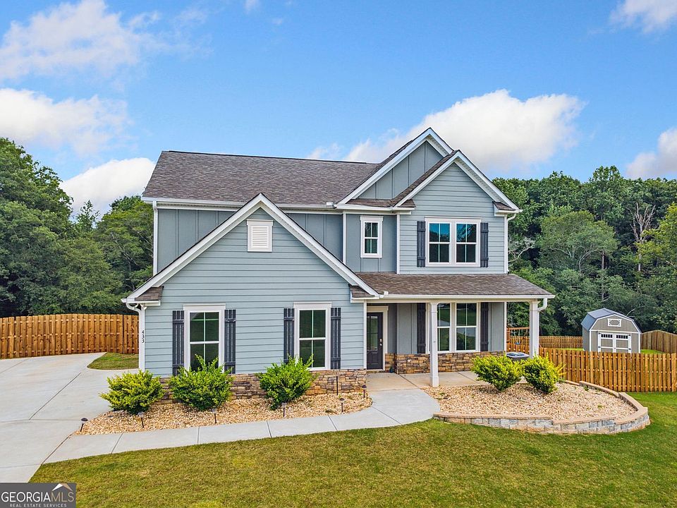 Elegant Comfort Meets Natural Serenity - Spacious 4BR/3BA on 1.49 Acres in Cornelia. Tucked away in a peaceful cul-de-sac on a sprawling 1.49-acre lot, this stunning 4-bedroom, 3-bathroom home blends timeless elegance with everyday comfort in scenic Habersham County. Just minutes from the mountains, you'll enjoy the beauty of mature trees, a meandering creek, and breathtaking views-all in a tranquil setting with minimal traffic. From the charming covered front porch to the sun-filled interior, every detail invites you in. The main level showcases 9-foot ceilings and durable luxury vinyl flooring throughout the main living areas. A formal dining room provides the perfect backdrop for entertaining, while the spacious family room features a cozy stacked stone fireplace that anchors the space. The open-concept kitchen is a chef's delight, boasting a large granite island, ample cabinetry, and a bright breakfast nook that flows seamlessly into the main living area. A full guest suite on the main floor adds versatility-ideal for visitors, a home office, or playroom. Upstairs, a generous loft landing offers space for a second living area, home gym, or media room. The luxurious primary suite is a serene retreat, complete with tray ceilings, a spa-style bathroom with dual vanities, an oversized tiled shower, and an expansive walk-in closet. Two additional bedrooms share a beautifully updated bath with granite counters and dual sinks. Step outside to the covered back deck and take in the peaceful view of the tree-lined creek beyond the fully fenced backyard. A staircase leads down to a wide green space-perfect for gardening, play, or outdoor entertaining-with a storage building ready for your tools and gear. Offering refined finishes, a flexible floor plan, and serene outdoor living, this exceptional Cornelia home is the perfect blend of space, style, and nature-just a short drive from mountain escapes and everyday amenities.