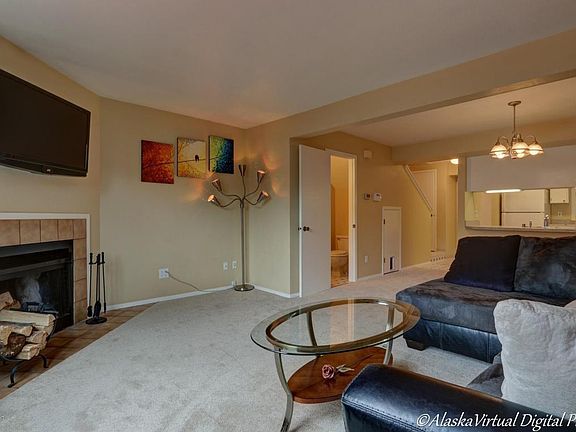 Beautiful updated 2 bedroom 1.5 bath S. Anchorage Condo. New carpet, new paint, fenced in backyard with new decking and paint. Wood fire place and carport. Dues include insurance, snow removal, water, Rufuse, exterior maintanence, grounds maintanence AND basic cable!!