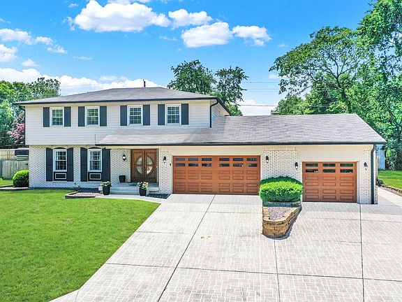Welcome to this stunning 2-story home in Hill Valley Estates, an entertainer's dream with numerous custom upgrades! This spacious residence offers multiple levels of entertainment spaces and a true backyard oasis. Enjoy the vibrant sunroom, oversized deck, heated pool, and dedicated pool bathroom-perfect for hosting the event of the summer right in your own backyard! As you enter through the impressive double doors, you'll be wowed by the immaculate parquet flooring in the foyer and dining room, the detailed woodwork throughout, and the accommodating layout. The sleek kitchen features newer stainless steel appliances, a custom-built island, two-tone cabinetry, a custom pantry with pull-out shelving, and terracotta flooring. The open-concept living room is highlighted by recessed lighting, an electric fireplace, and built-in shelving. Upstairs, the primary bedroom offers an en-suite bathroom, vanity counter, and a walk-in closet. The additional two bedrooms, airy loft area, and another full bathroom complete the upper level. The partially finished basement boasts a recreation room with a pool table, media room with built-in shelving, a half bath, laundry room with laundry chute, a storage room, and an egress window. The home also features outstanding curb appeal with an oversized stamped concrete driveway and a three-car garage. The third garage includes 12-foot ceilings, 100-amp service, a wall heater, and an I-beam for a 2-ton trolley, making it perfect for a hobby shop. Situated on a large lot on a quiet and prestigious cul-de-sac at the very back of Hill Valley Estates, this home offers both privacy and elegance. Recent updates include partial interior paint (2024), new carpeting in two bedrooms and family room (2024), electric pool heater (2022), pool liner (2018), deck (2018), Hardie Plank siding and soffits (2017), storage barn with electric (2017), HVAC system (2015), water heater (2014), 6" gutters and drainage system (2012), and replacement windows (2010).