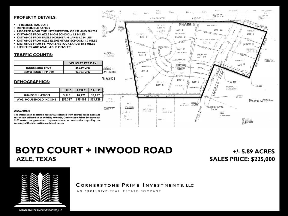 Cornerstone Prime Investments, LLC is featuring a conveniently located tract of Single-Family Residential Properties for sale in Azle, Texas. There are fifteen (15) Properties available and each are heavily-wooded containing large and small trees. The Properties are also located near the intersection of Jacksboro Highway 199 and FM 730 with travel times to local schools less than ten (10) minutes. Jacksboro Highway and FM 730 in Azle, Texas.