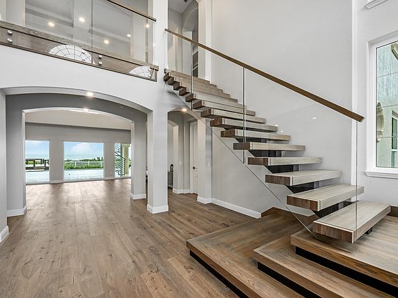 Welcome to this exquisite custom-built home, constructed in 1996, offering a generous living space of 4,758 sq ft. Nestled on a .58-acre lot with 100 feet of oceanfront, this property provides an idyllic coastal living. Recently remodeled and redesigned, this home showcases a modern aesthetic and impeccable craftsmanship. The highlight of the interior is the custom-built monostringer staircase, featuring 4'' white oak floating treads and elegant clear glass railings. This architectural masterpiece adds a touch of sophistication and serves as a focal point of the home. With two primary bedrooms, one on the main floor and another on the second floor, this home offers flexibility and convenience. The second-floor bedroom can be easily accessed via an elevator ensuring ease of movement throughout the home.